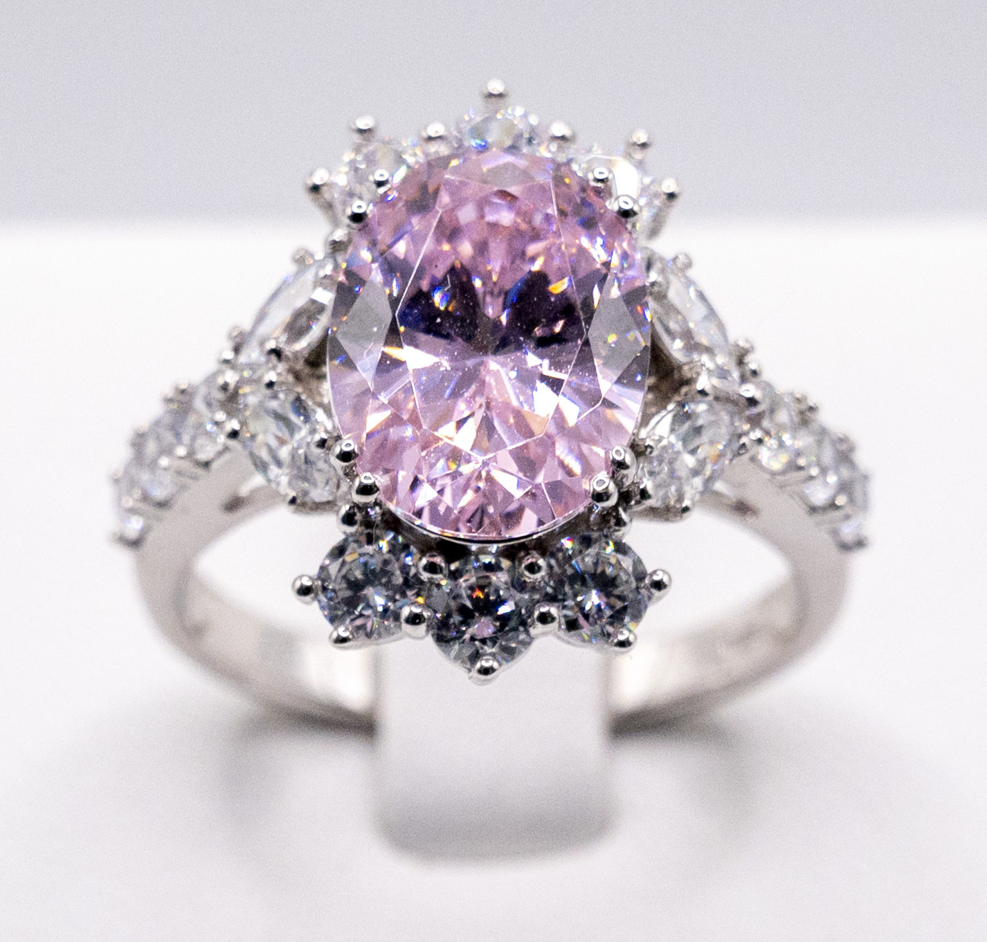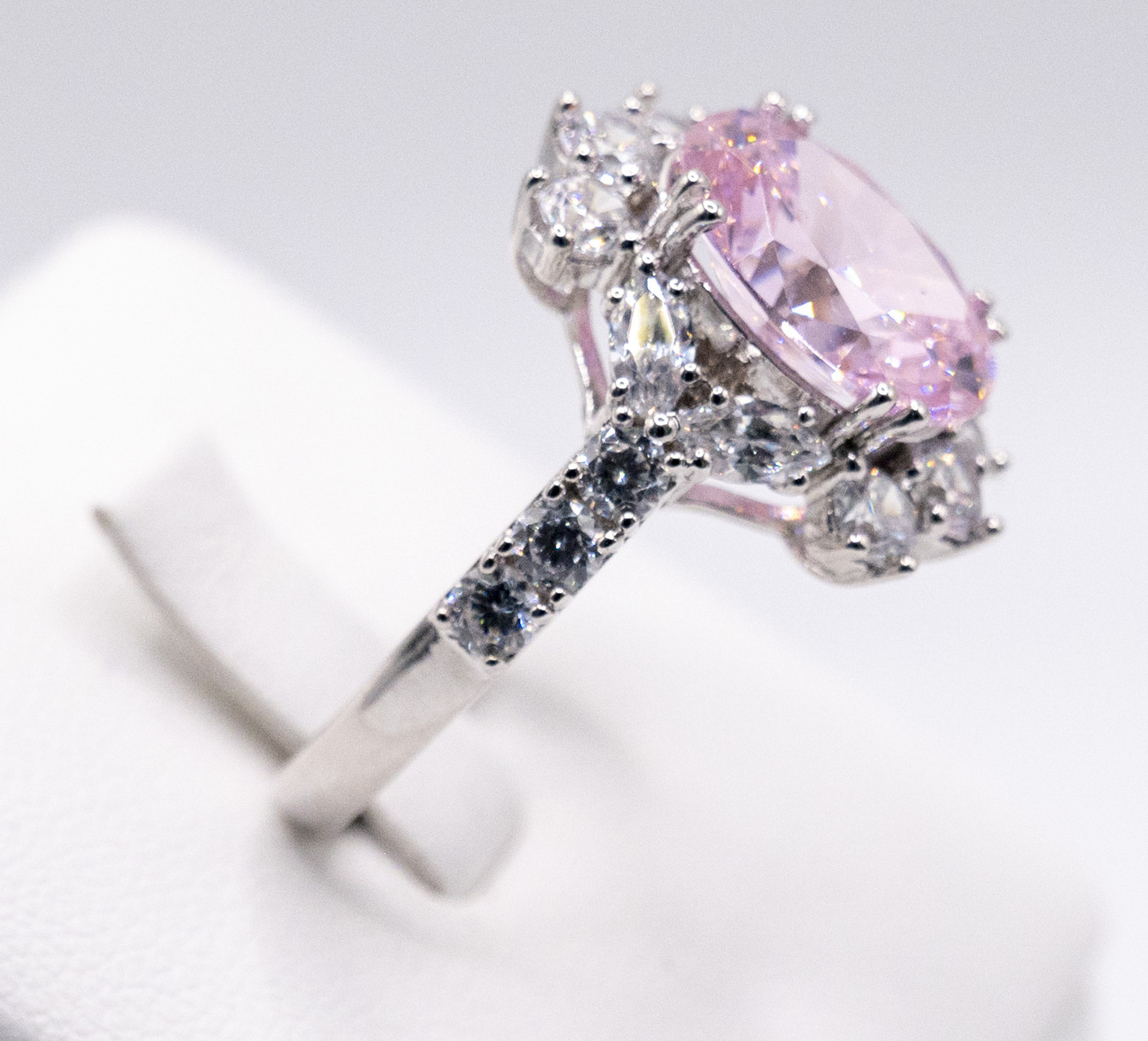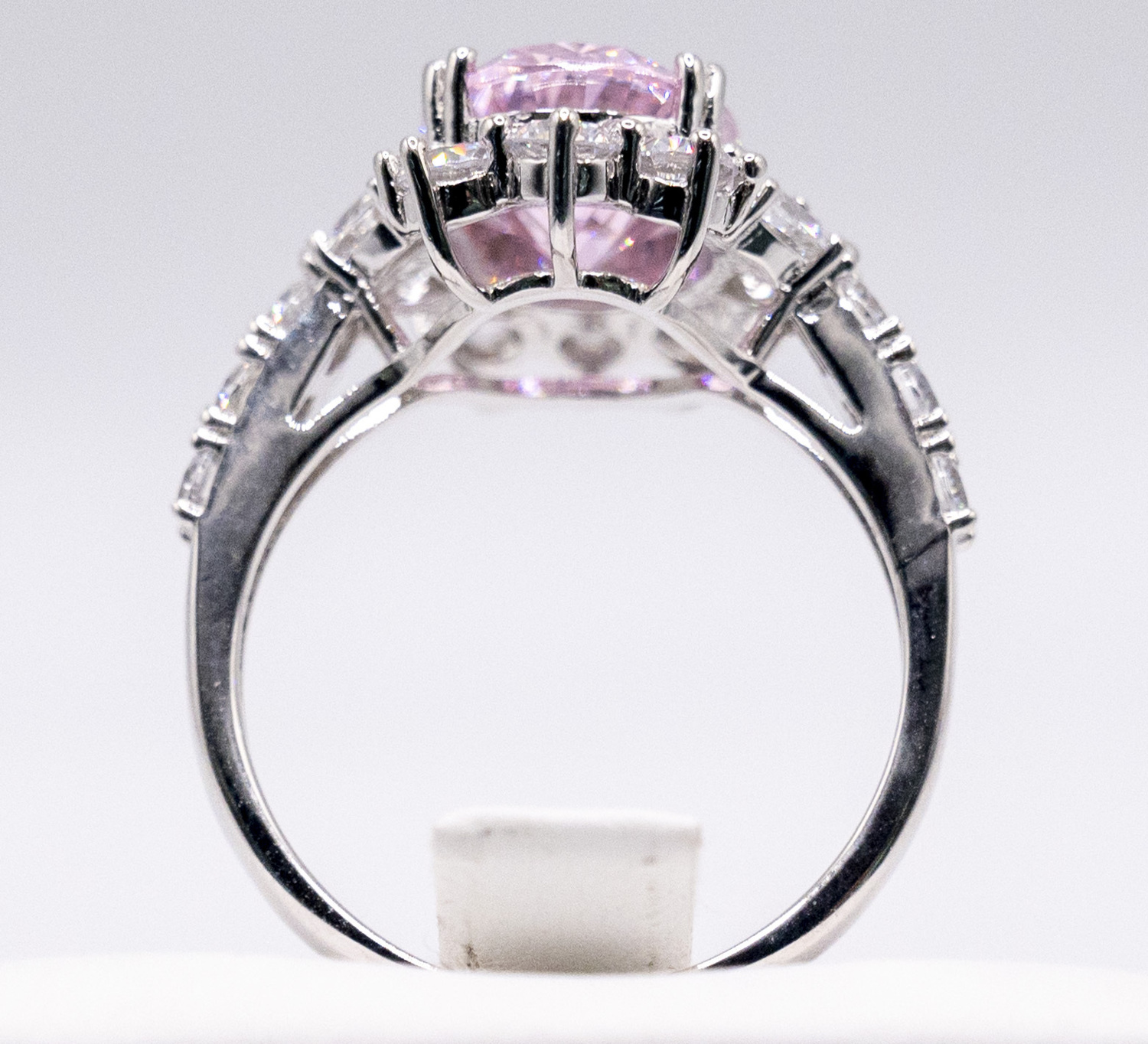 Pink moissanite gem stone set on rhodium plated 925 sterling silver ring