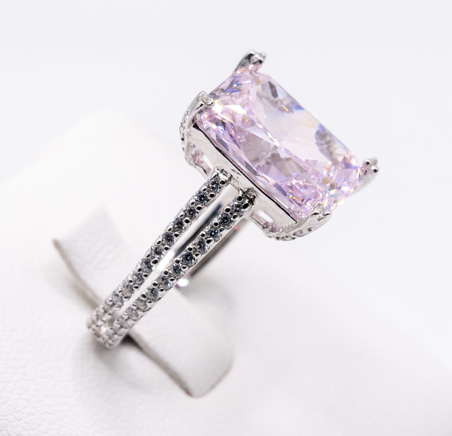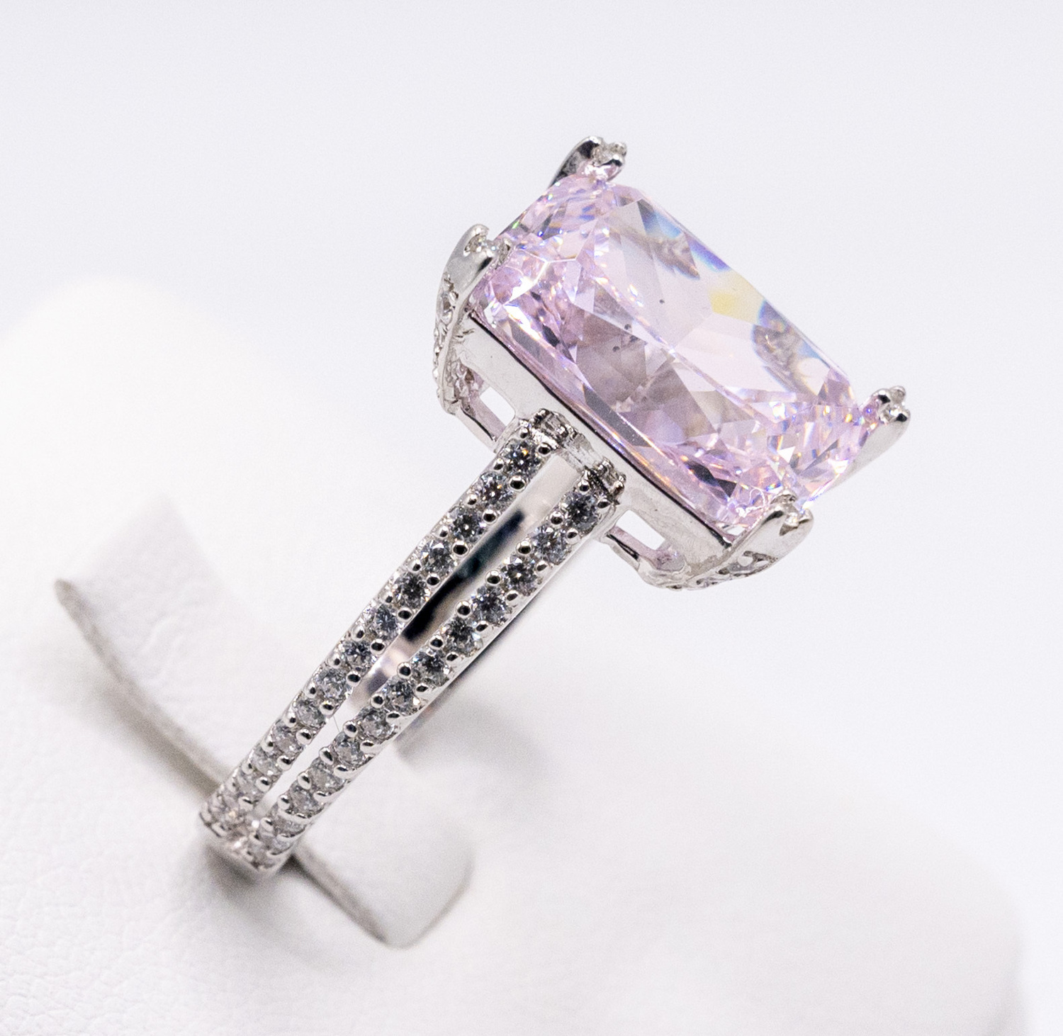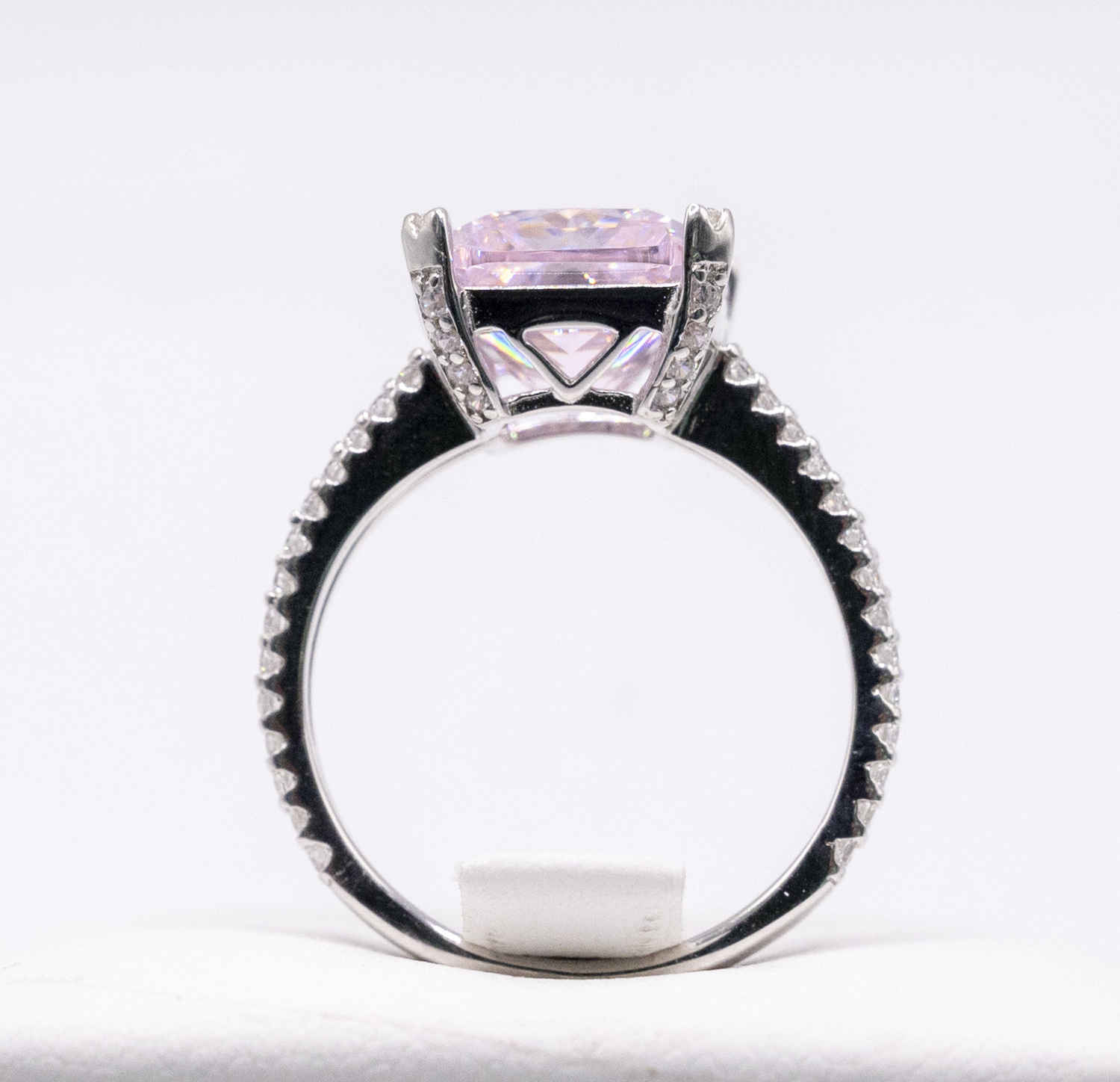 Featuring a rectangle cut pink moissanite stone complimented with multi paved twin accent stones