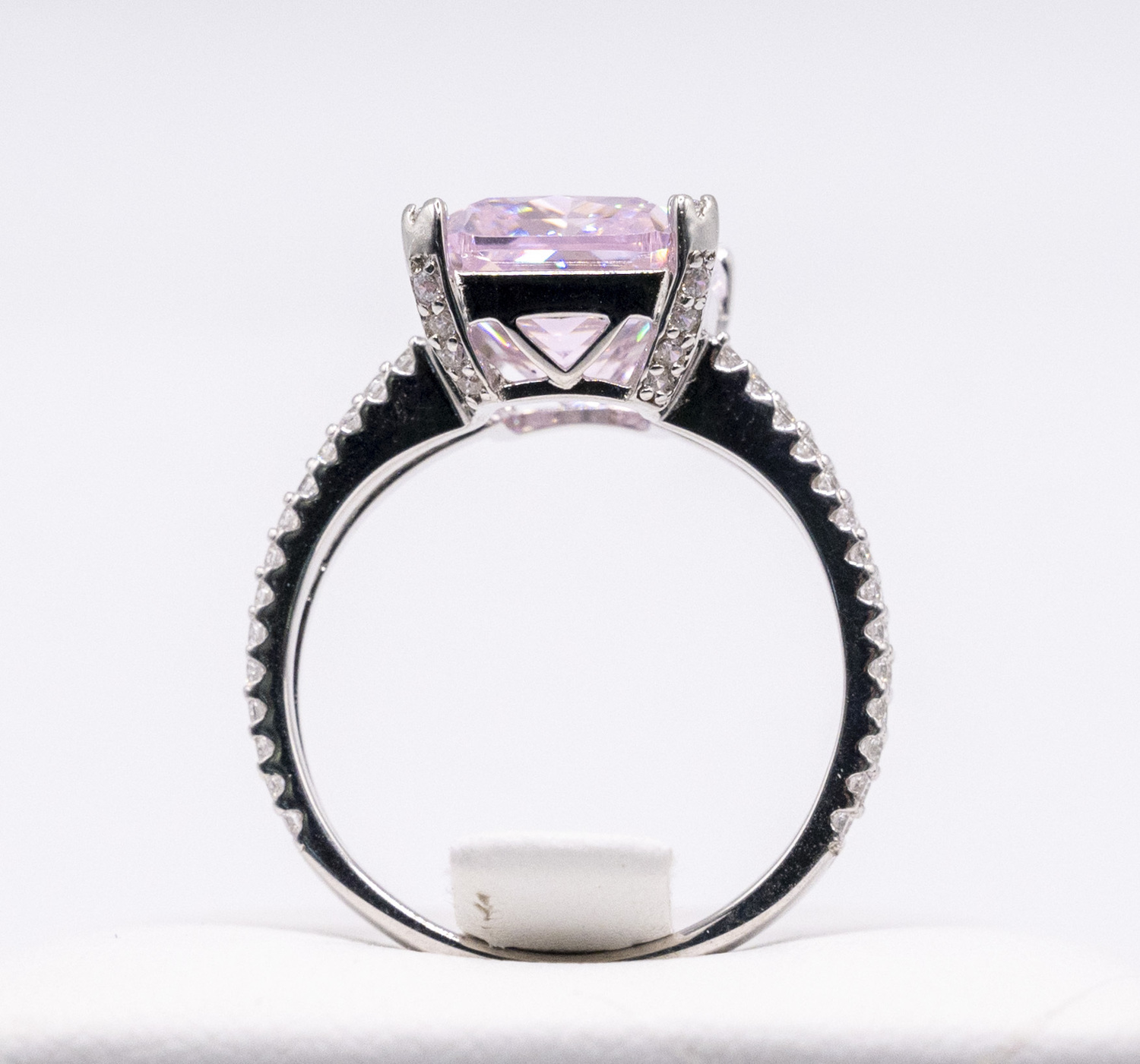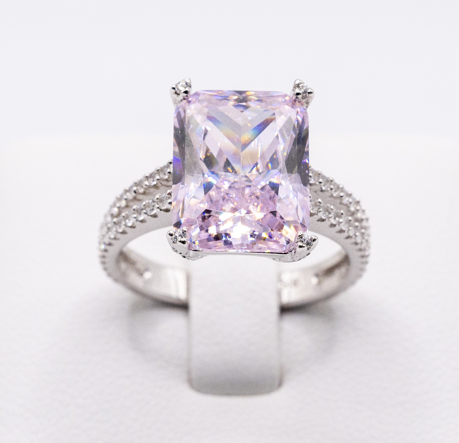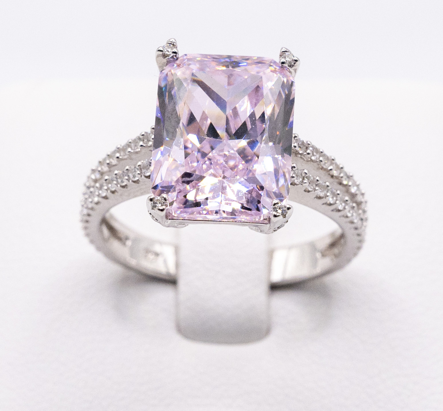 Featuring a rectangle cut pink moissanite stone complimented with multi paved twin accent stones