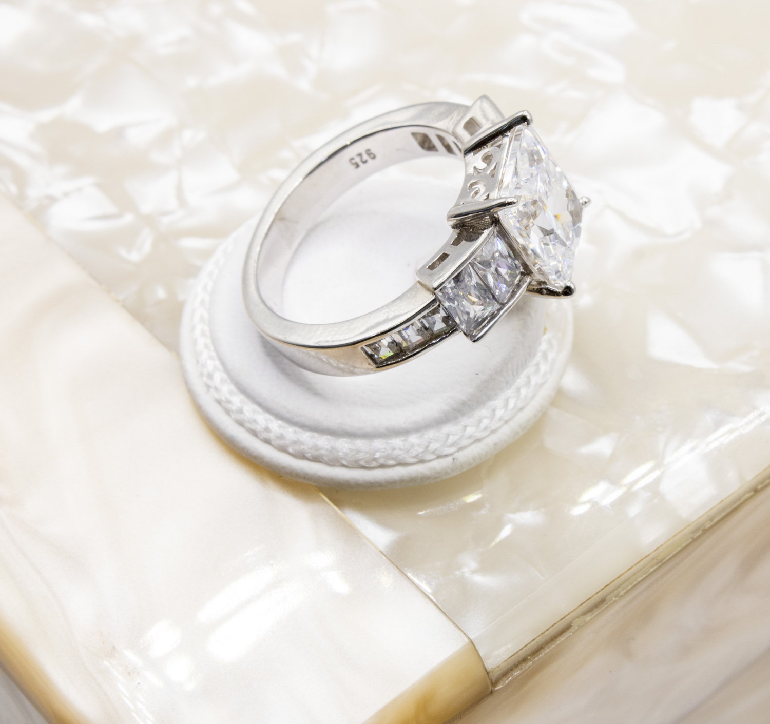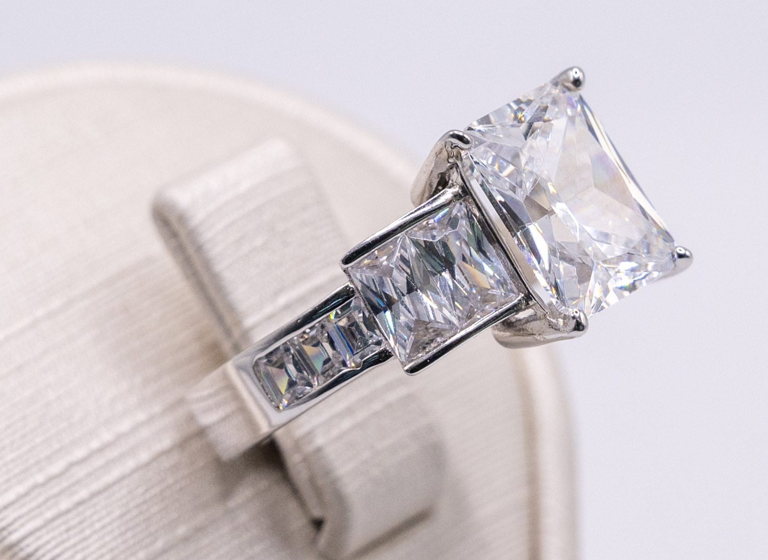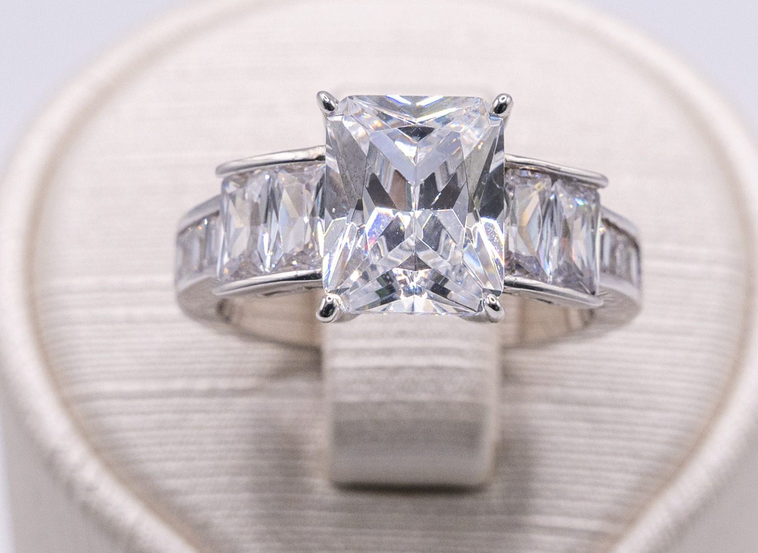 The centre stone is accentuated with baguette cut twin side and triple accent zirconia stones