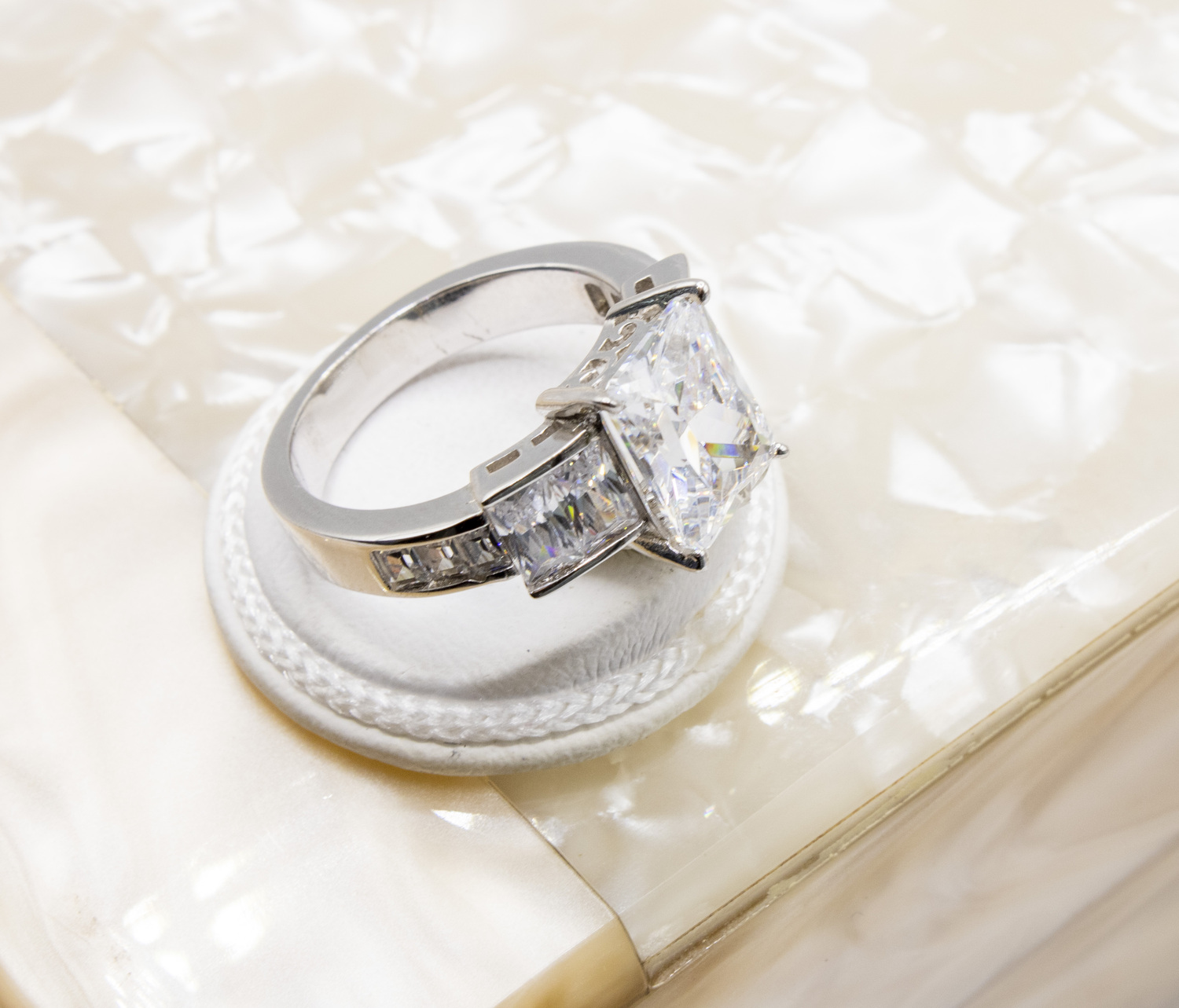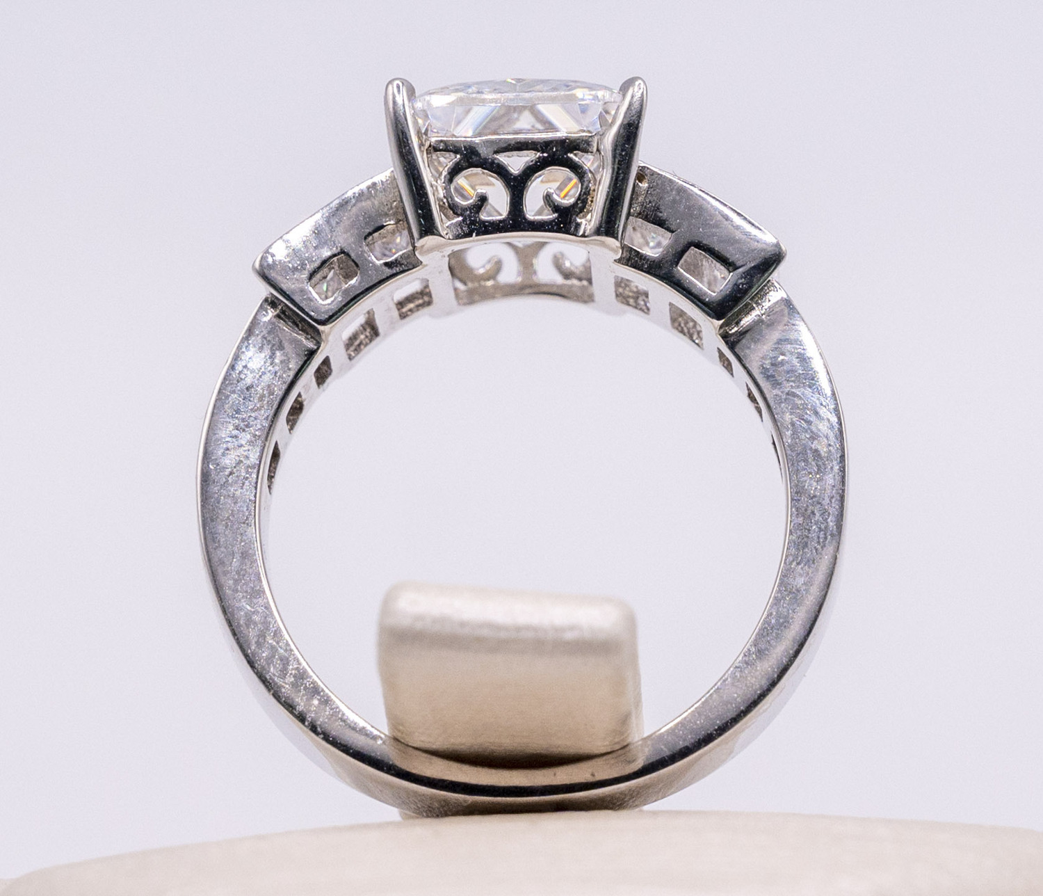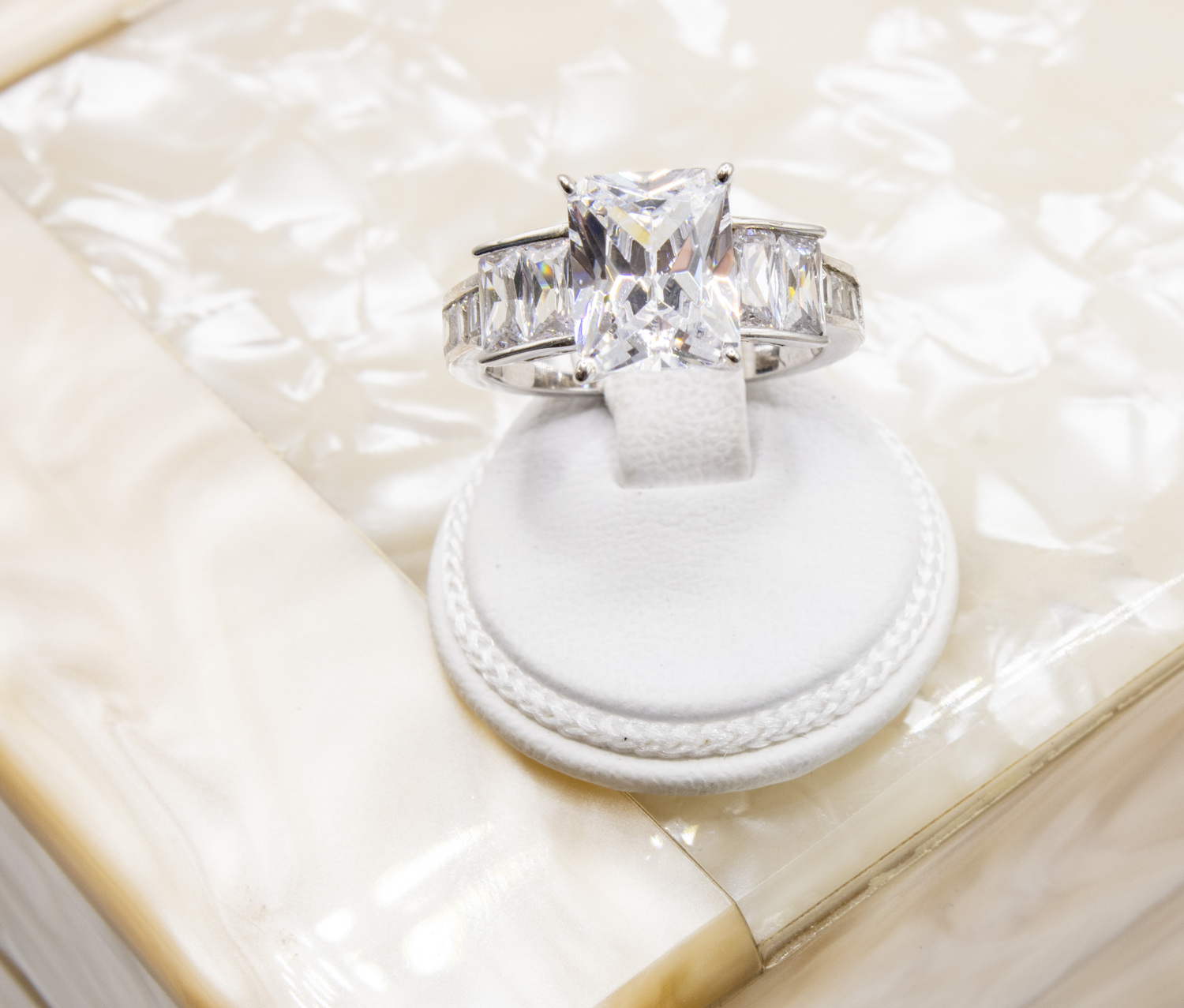 The centre stone is accentuated with baguette cut twin side and triple accent zirconia stones