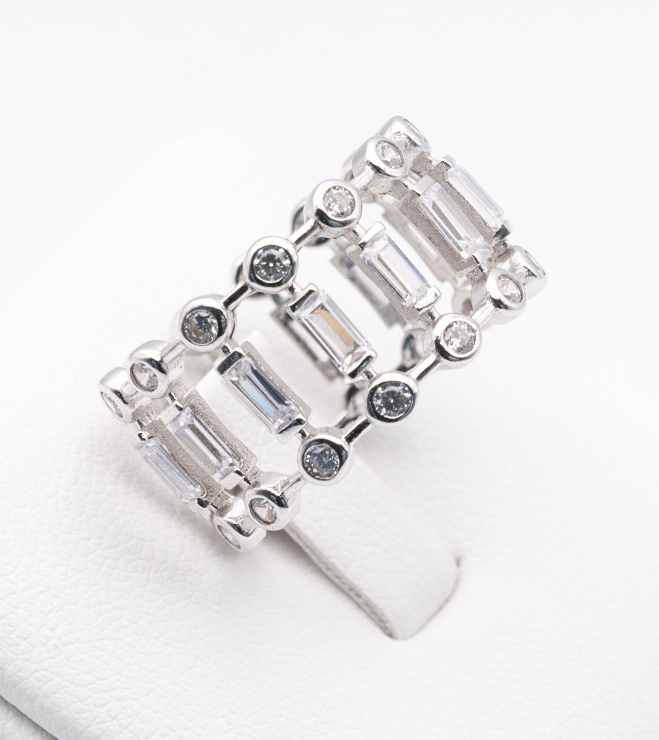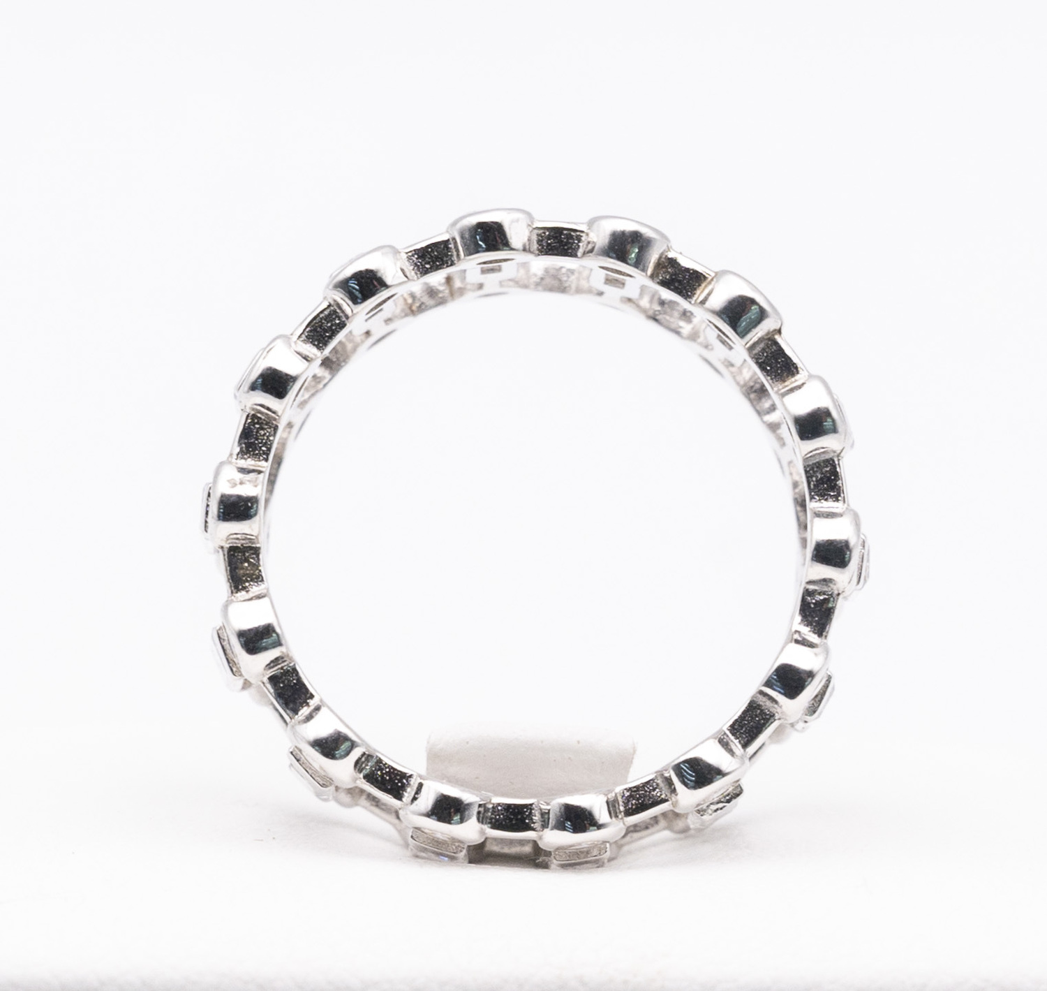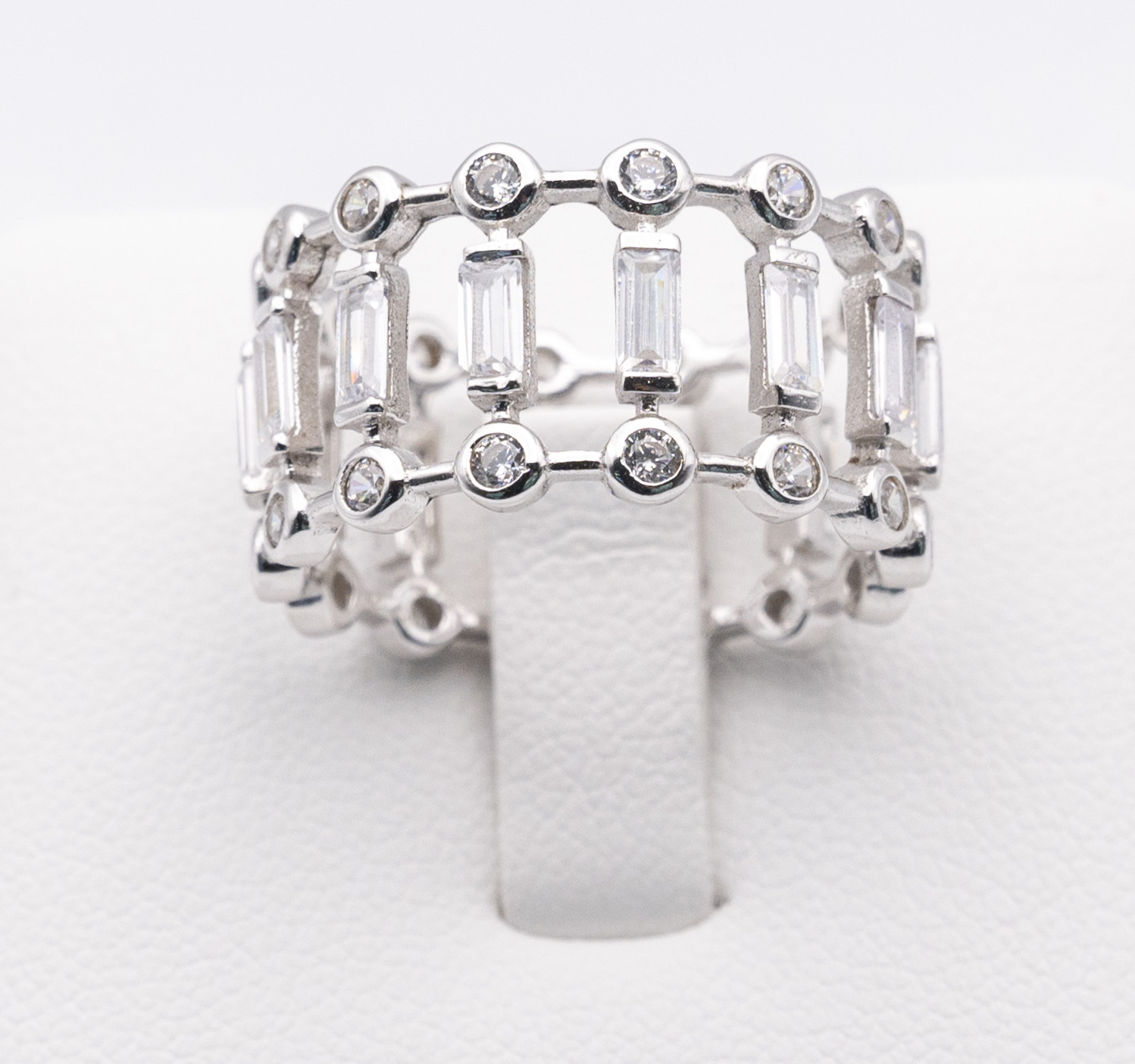 Rhodium (platinum white gold) plated 925 sterling silver ring with bezel set zirconia gem stones