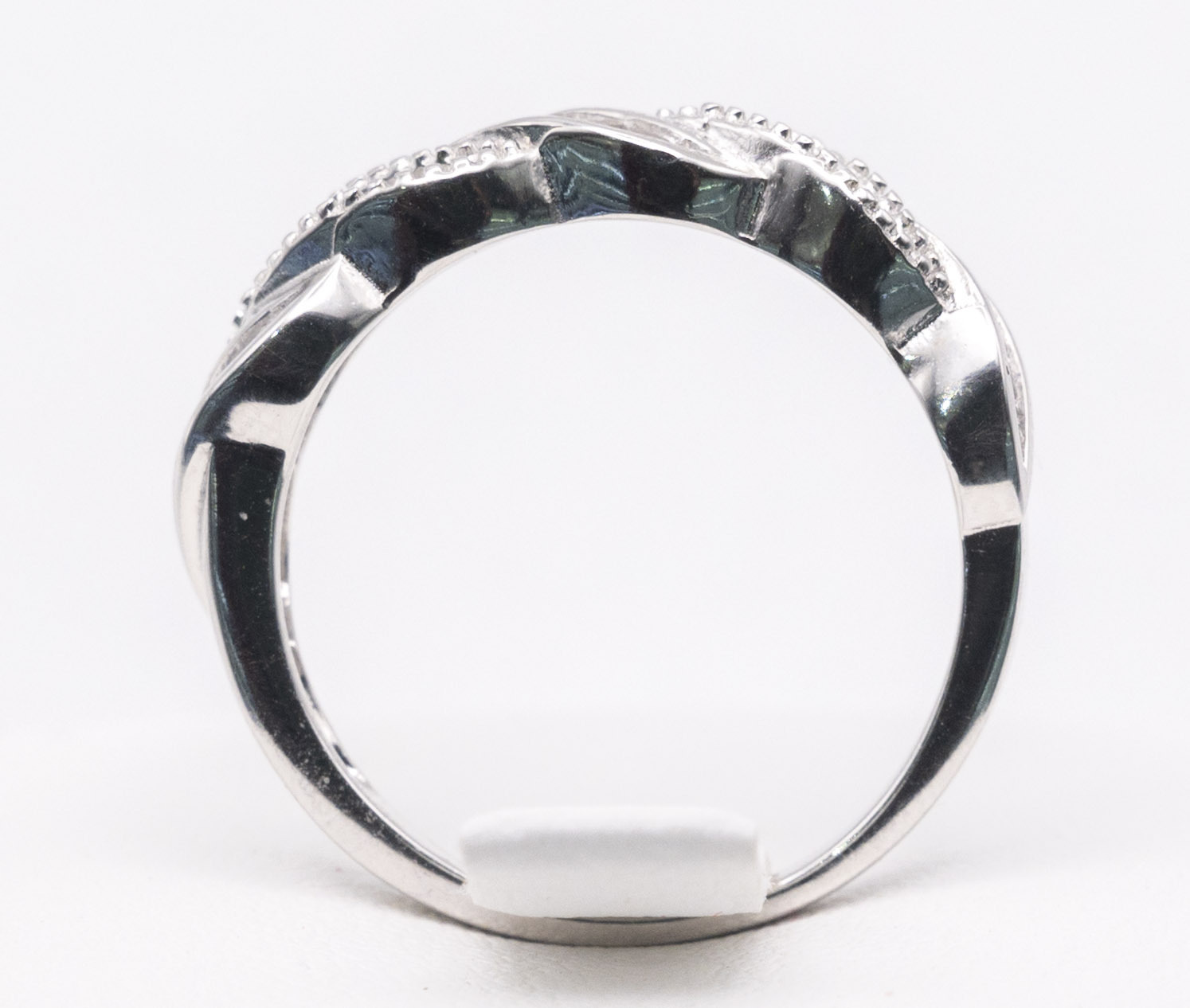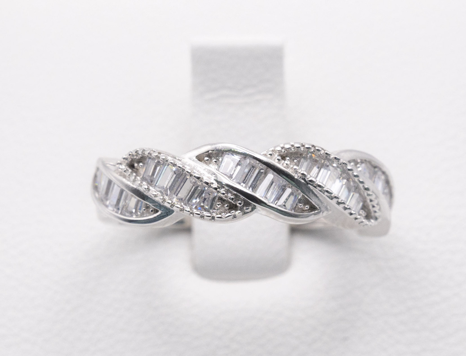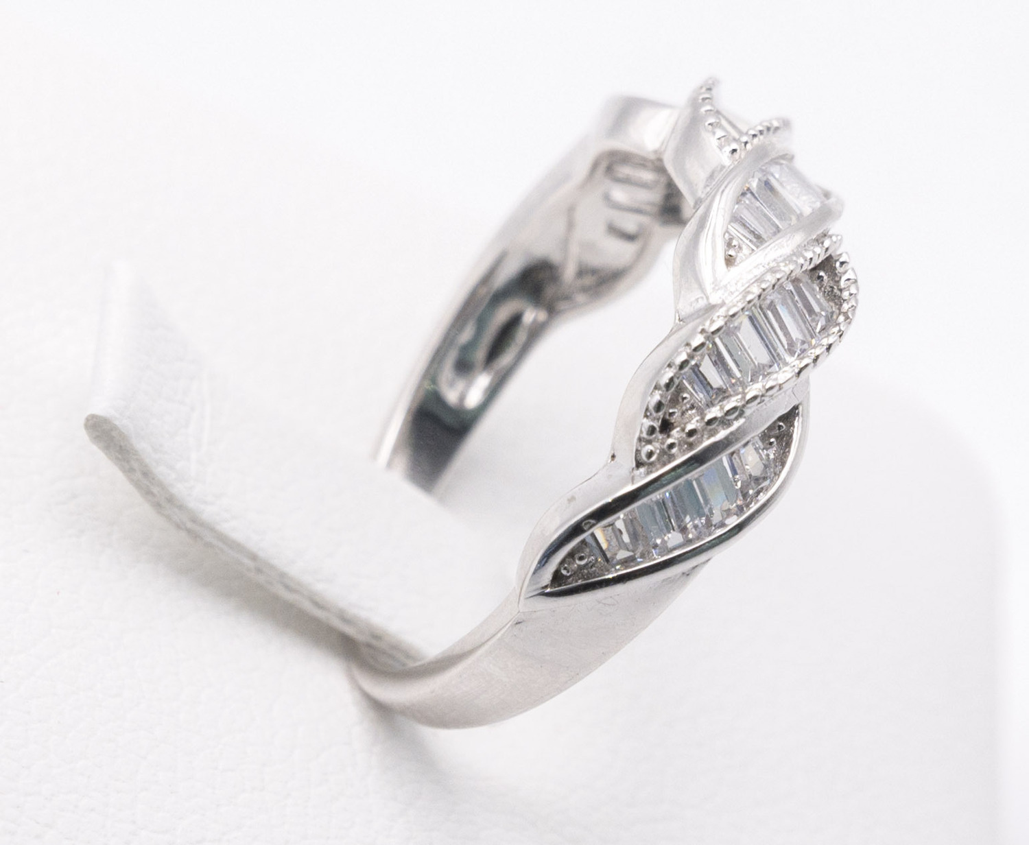 Rhodium (platinum white gold) plated 925 sterling silver ring with baguette cut overlapping zirconia stones