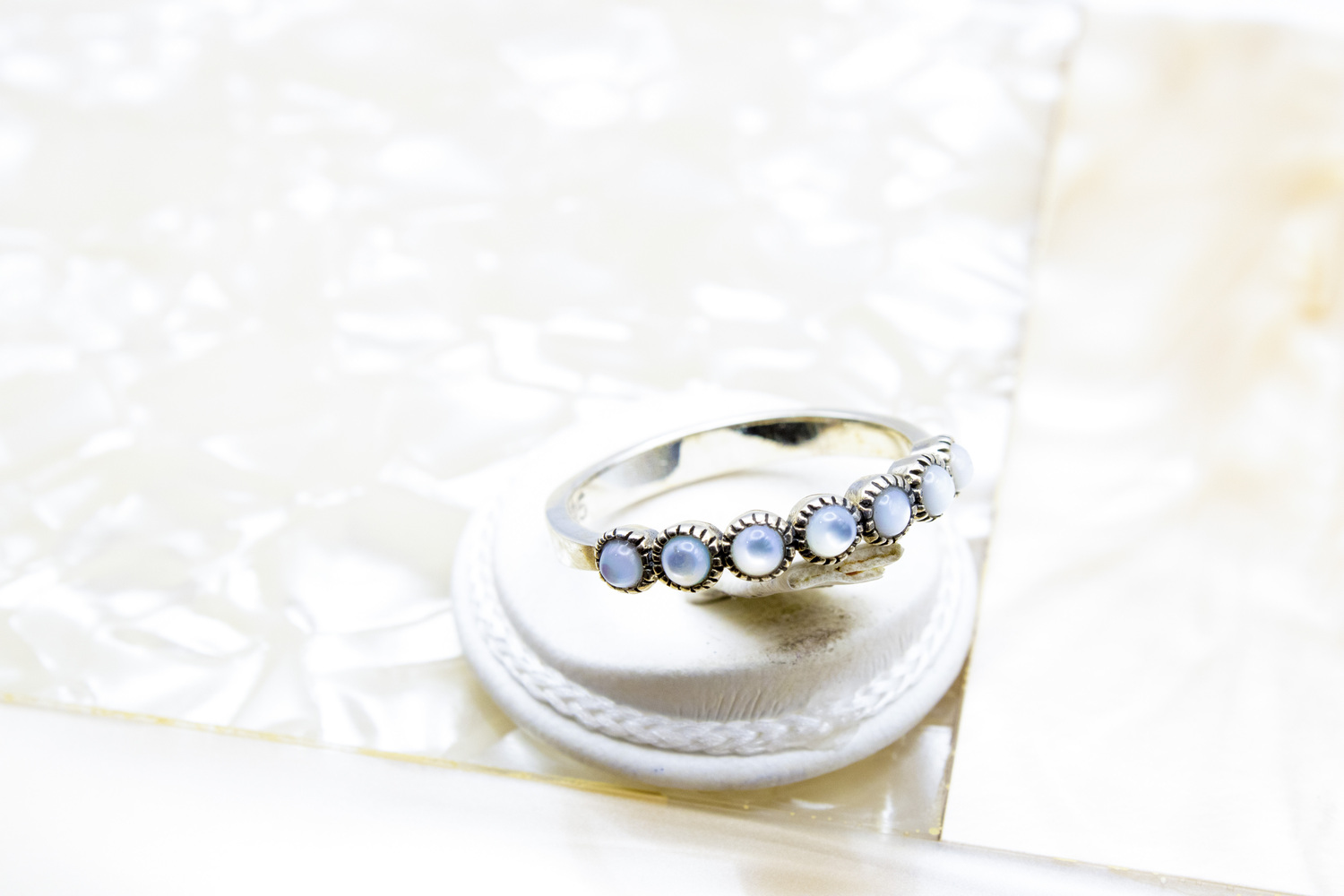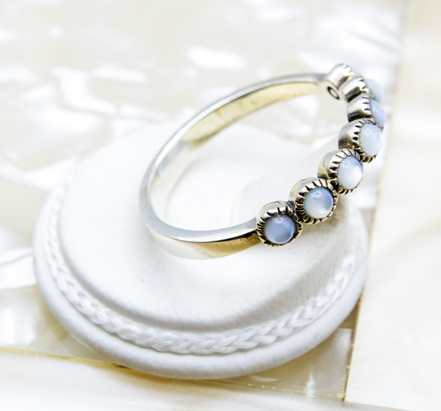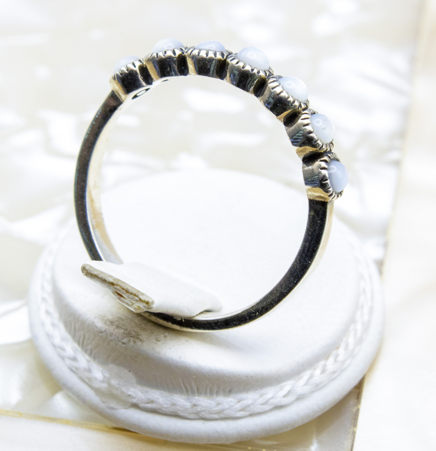 2mm lower shank, half eternity silver ring with bezel set moon stones each measuring 3mm (0.3cm) in radius