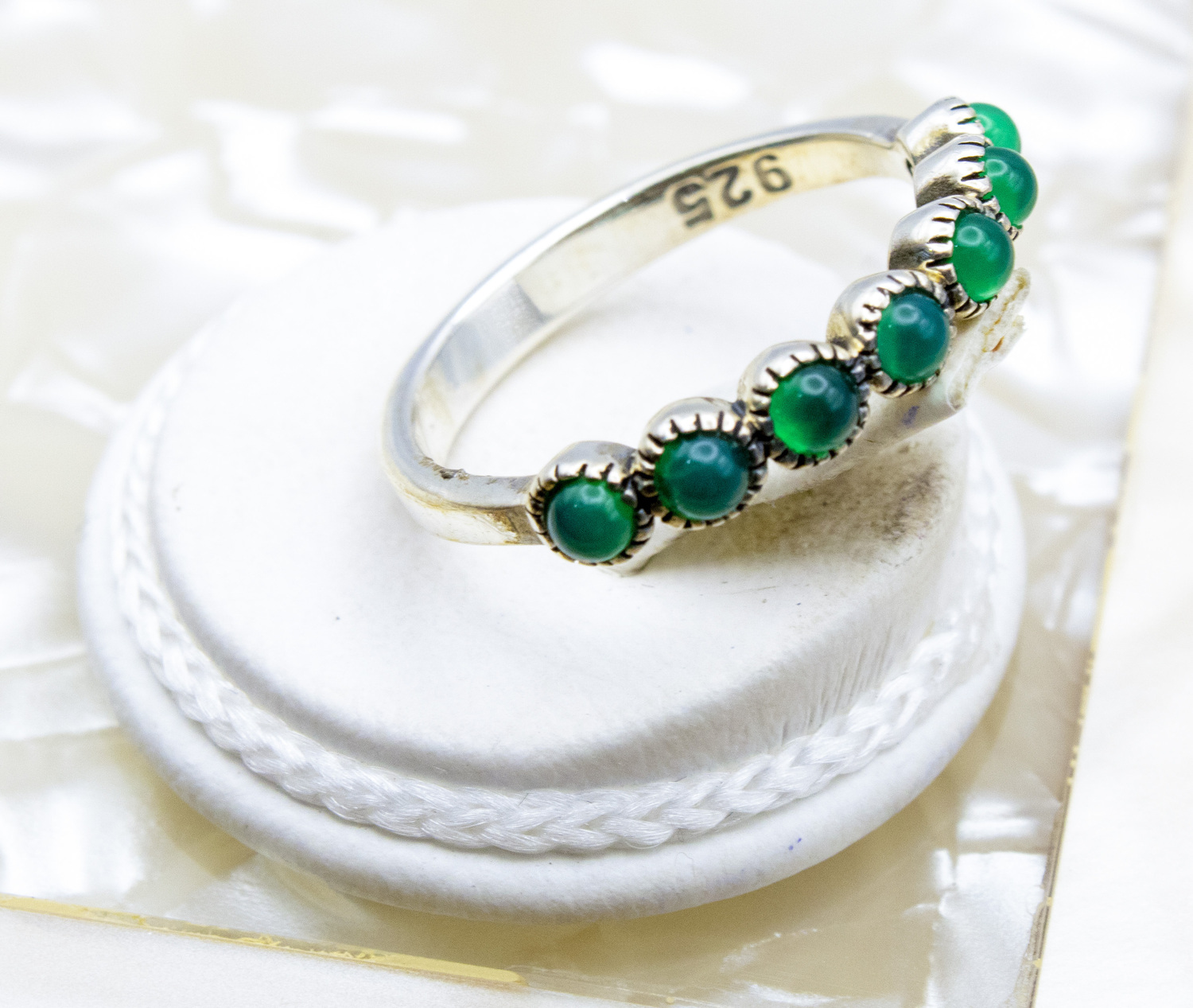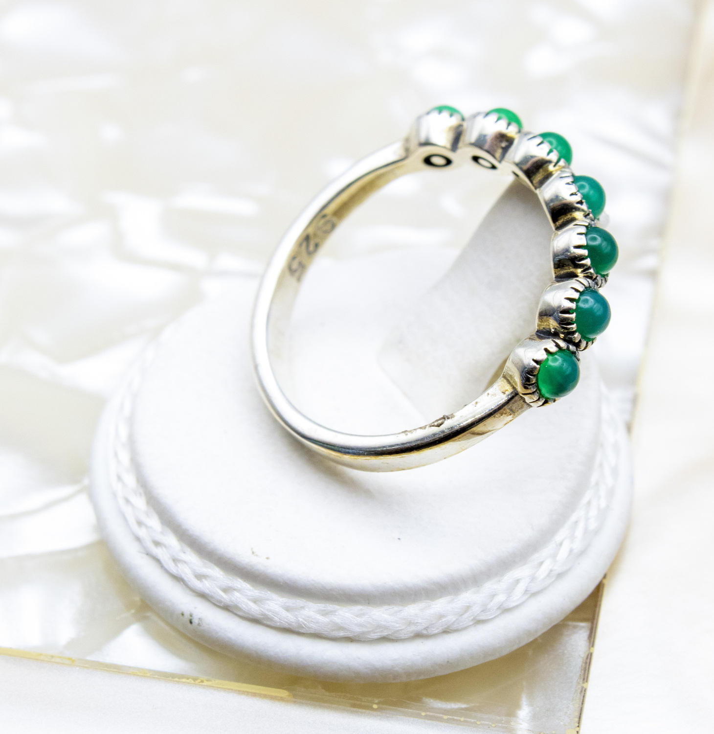 2mm lower shank, half eternity silver ring with bezel set green jade stones each measuring 3mm (0.3) in radius