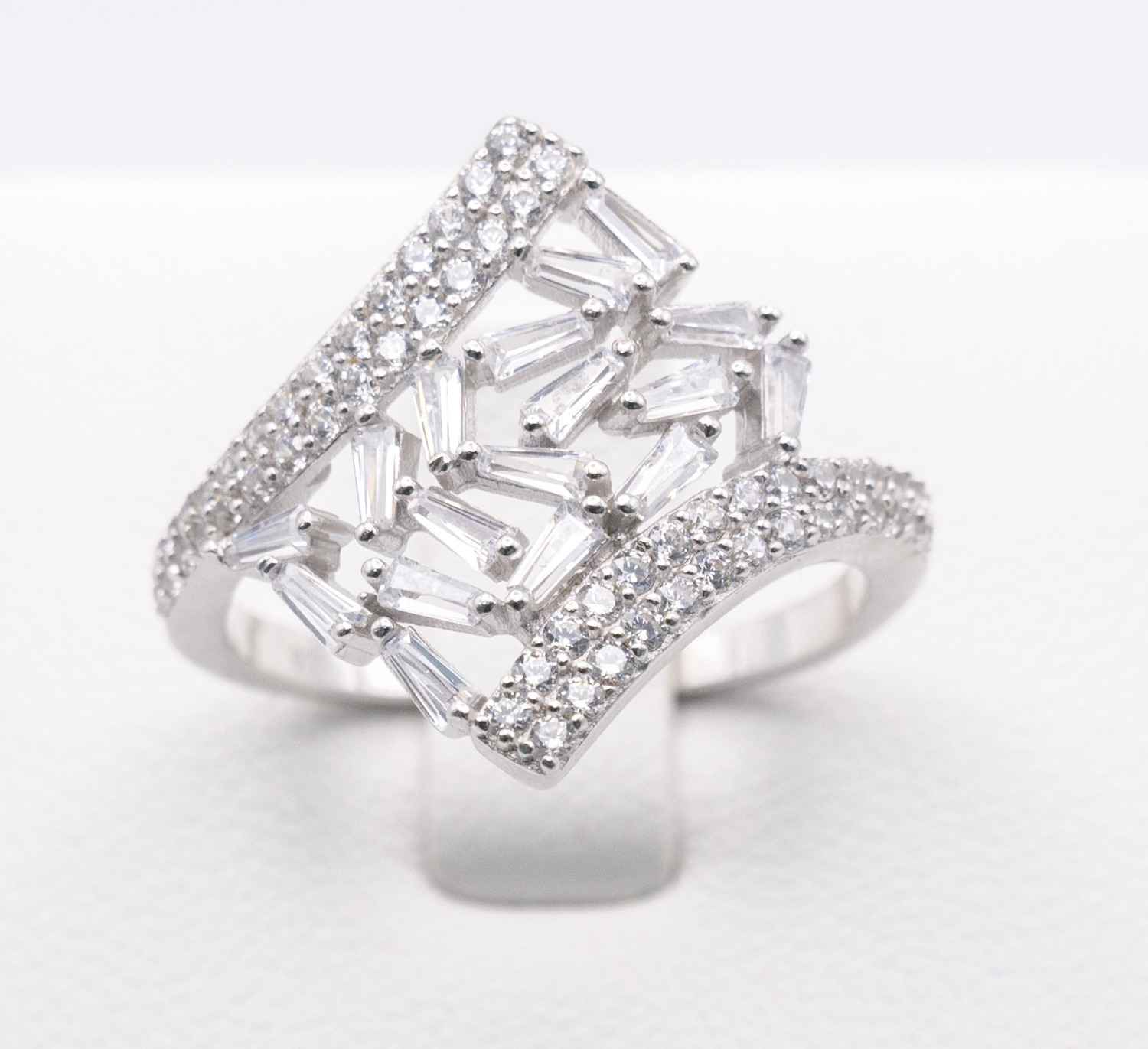 Featuring a tension set baguette cut zirconia stones set on silver