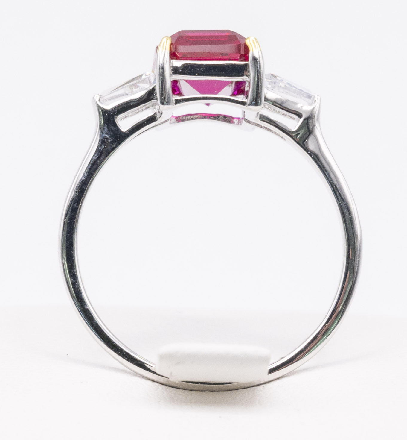 The ring façade measures around 18mm (1.8cm) in width including the twin side accent stones and 9mm (0.9cm) in length