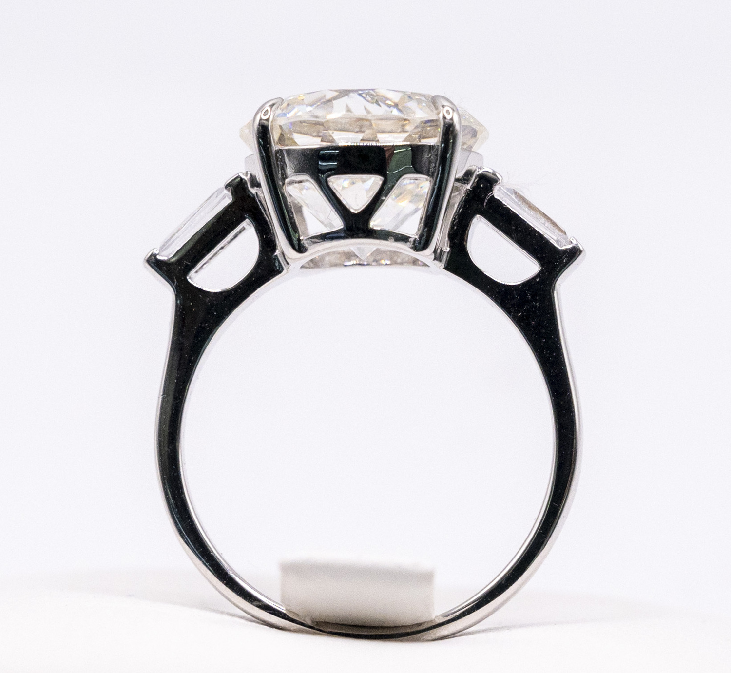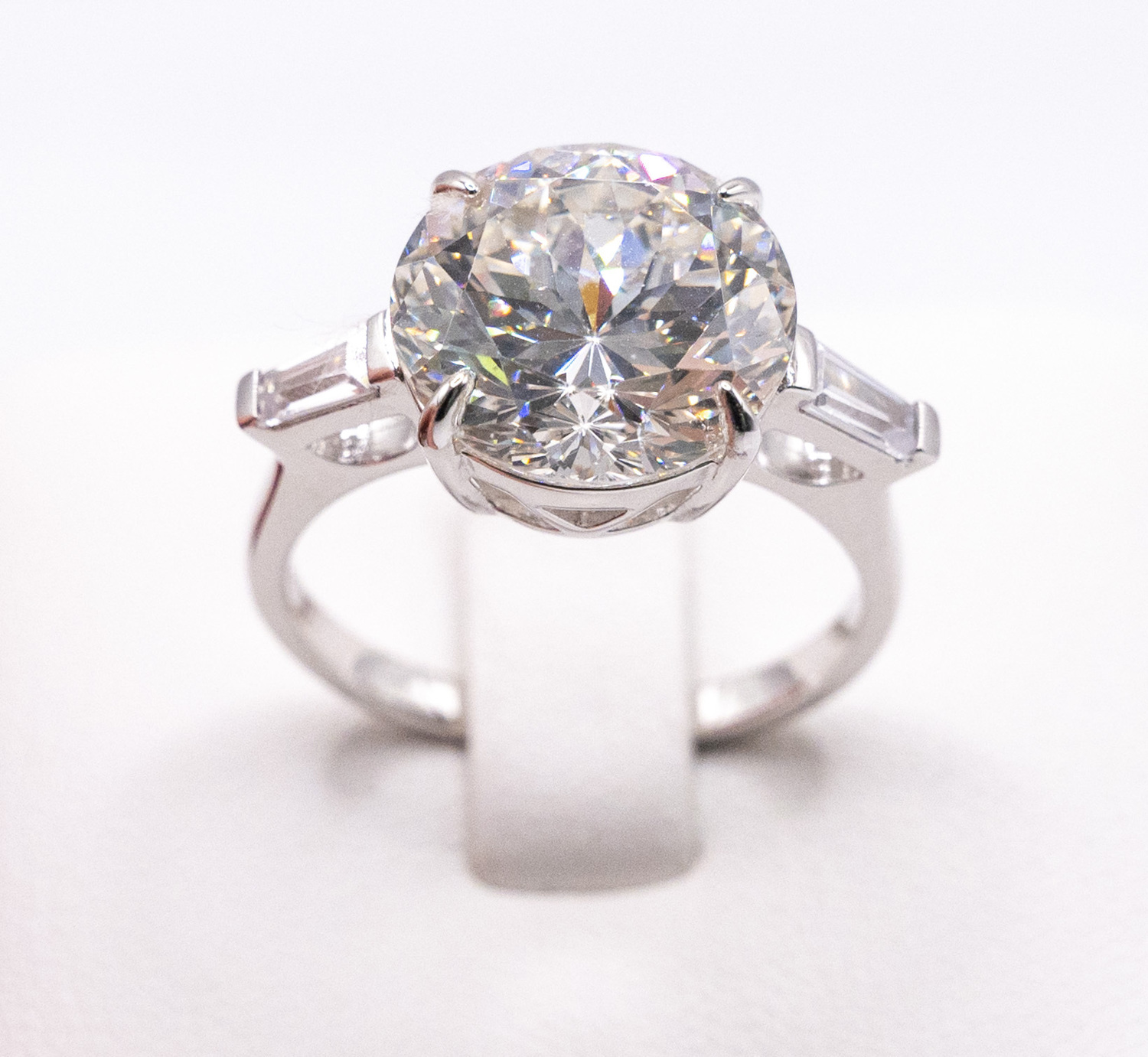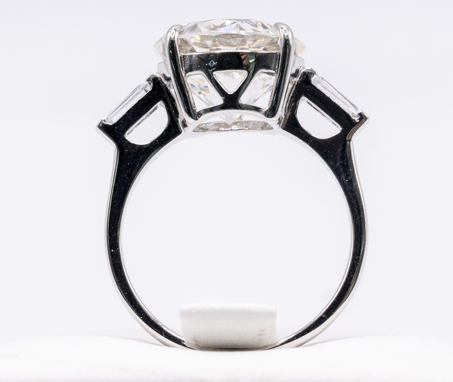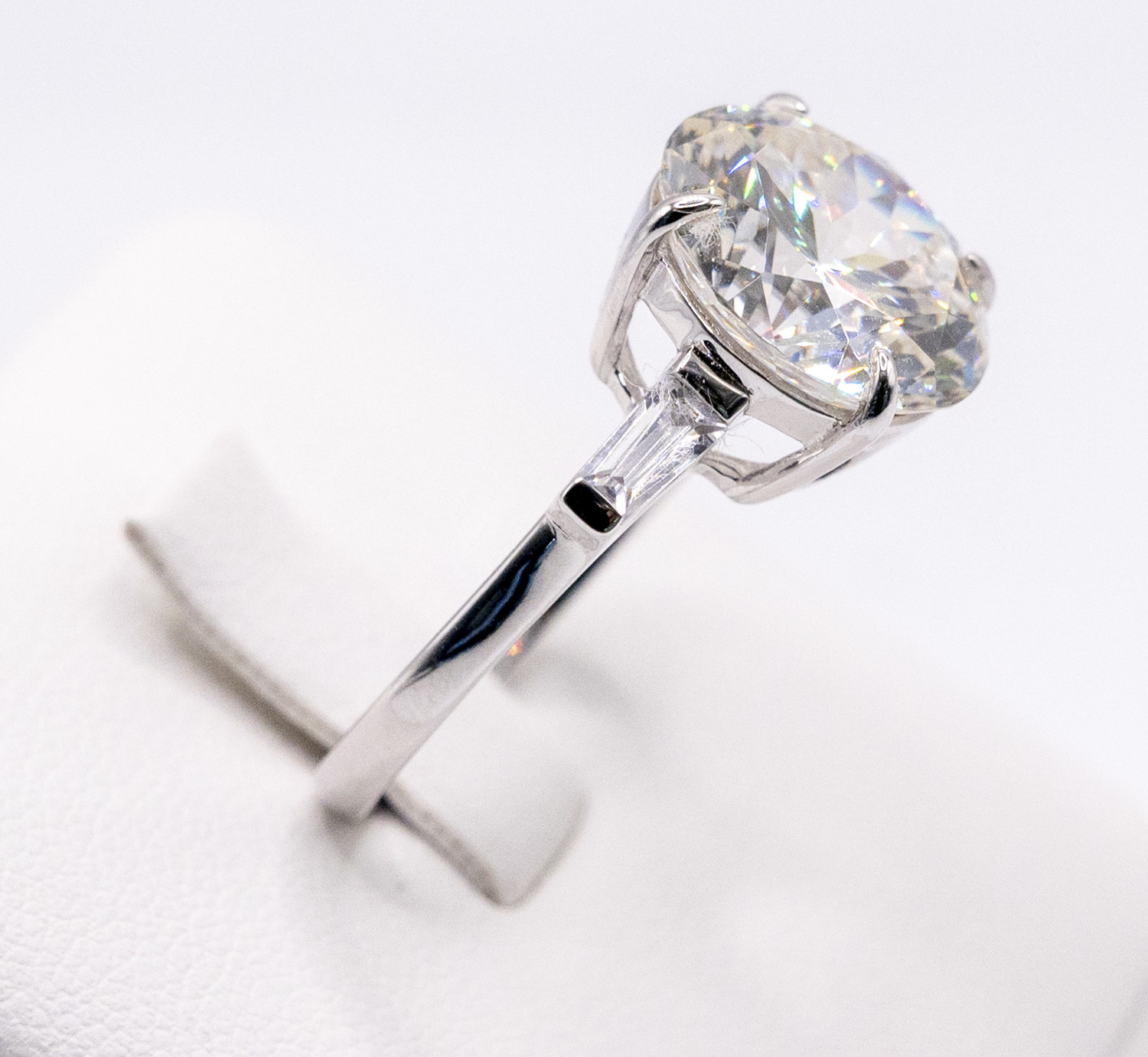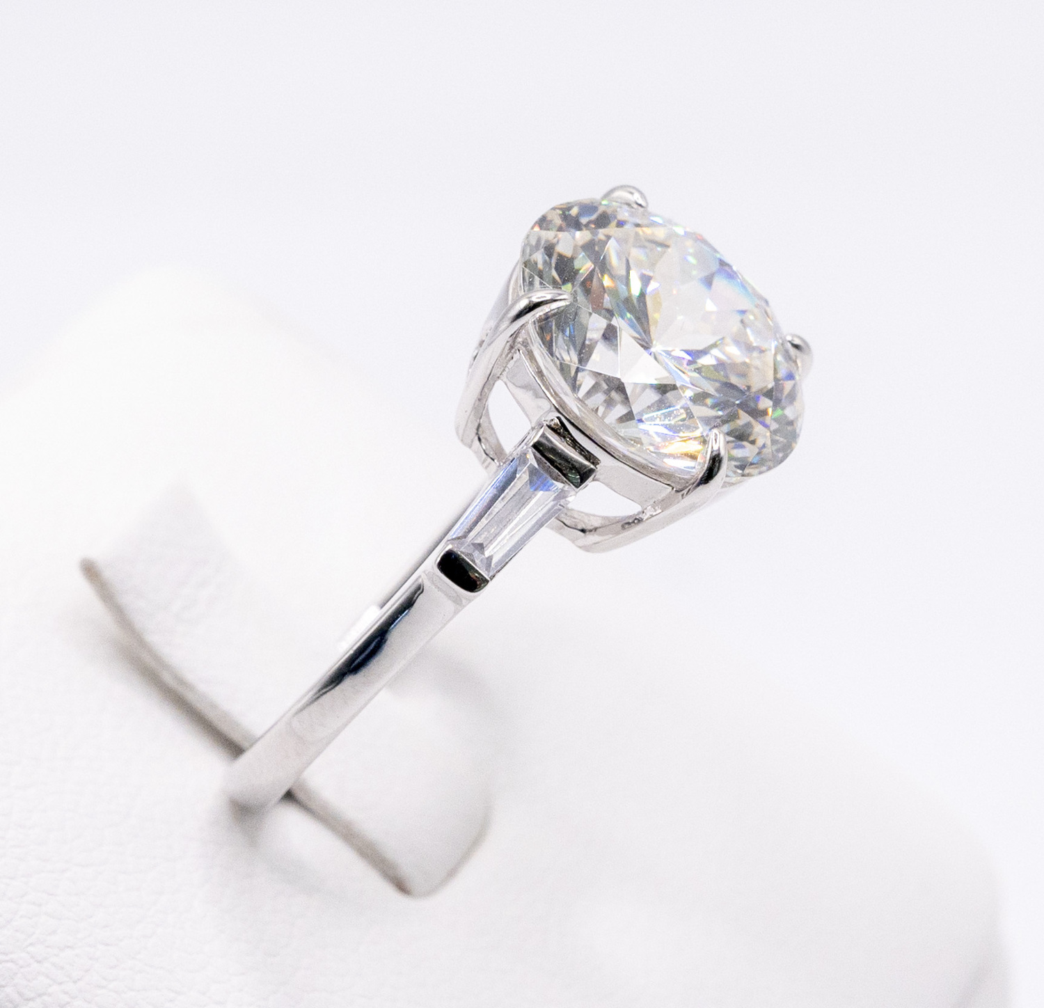 Featuring a solitaire round cut clear moissanite stone complimented with baguette cut twin side stones