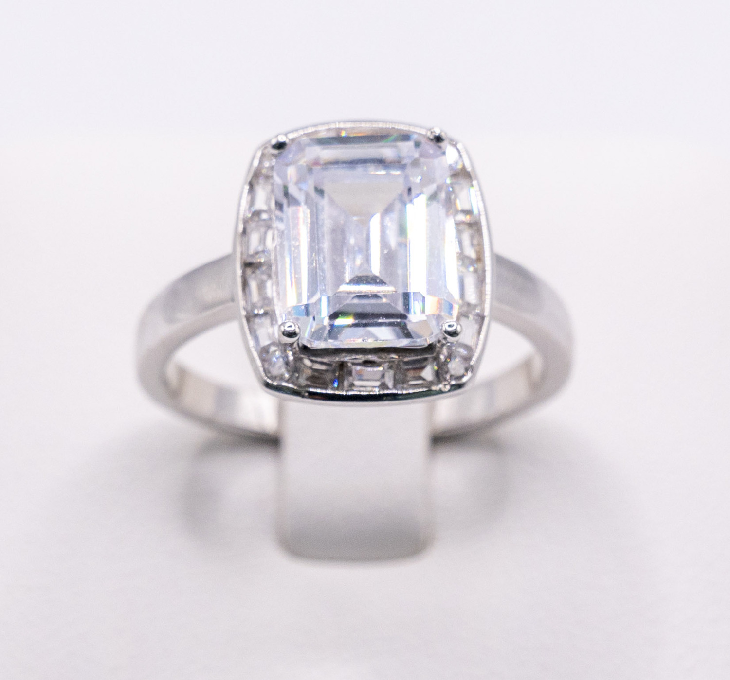 Engagement style ring bordered with multi paved baguette cut zirconia stones